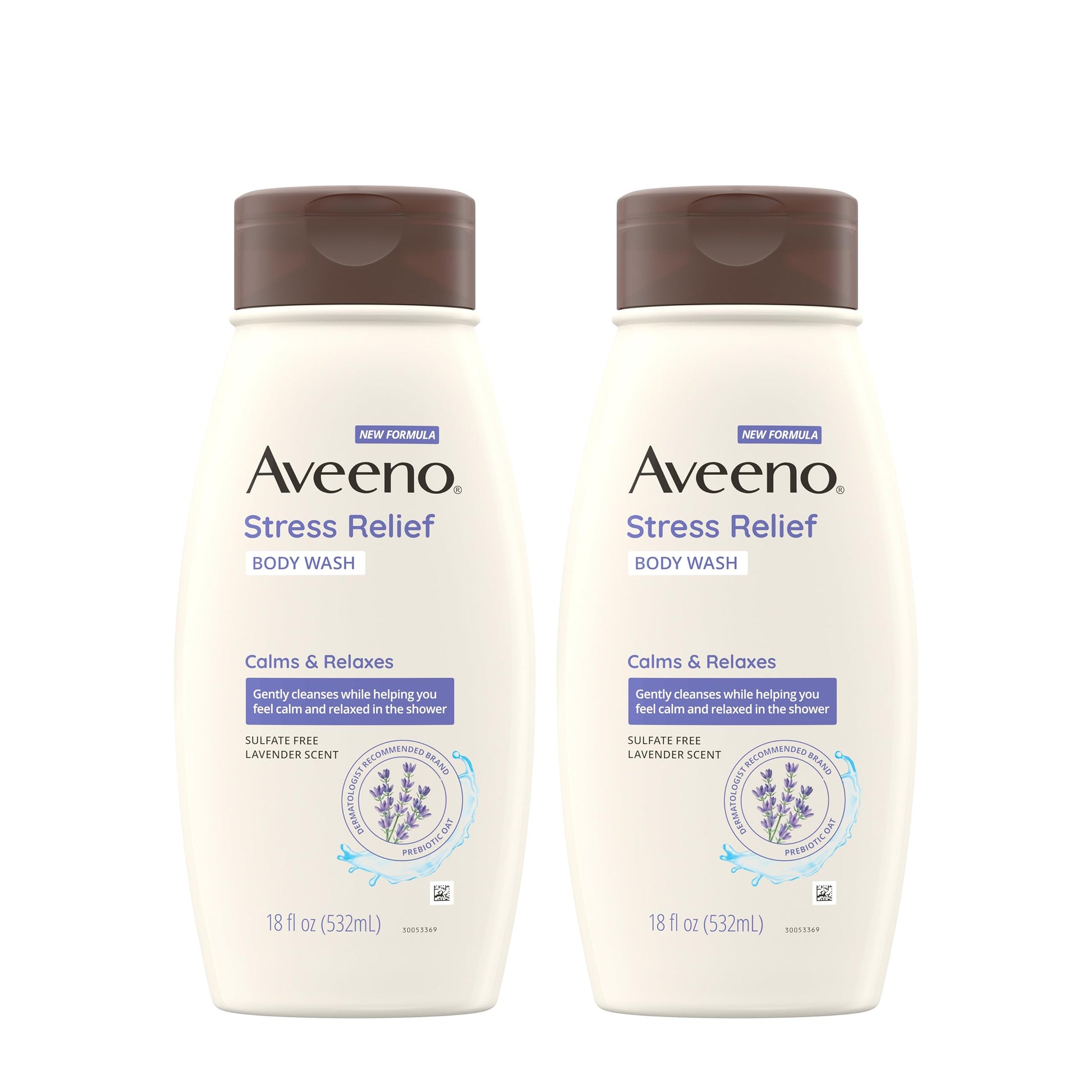 - Twin pack of two, 18-fluid ounce value size bottles of Aveeno Stress Relief Body Wash with oat & calming lavender scent gently cleanses while removing dirt, oil & impurities.Daily body wash is clinically shown to help calm & relax you in the shower